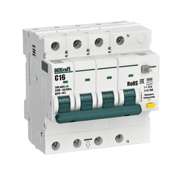 Автоматические выключатели дифференциального тока серии ДИФ-103 6кА NEW Dekraft; 3P+N; номинальный ток 16 А; ном. диф. ток 300 мА; тип диф. расцепителя — A; кривая отключения — С; Icn, Ics = 6 кА; тип устройства — электронный; монтаж – на DIN-рейку. АВДТ обеспечивают три вида защиты — от короткого замыкания, перегрузки и возникновения утечки тока (в частности, вследствие прикосновения человека к токоведущим частям).
